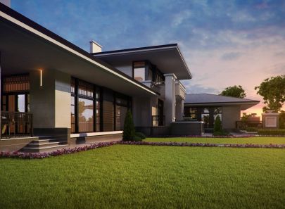 Из общего вида дома выделяется значительно выступающая и кажущаяся плоской крыша, которая словно создает ощущение приземленности и стабильности при относительной легкости всех остальных элементов. Четко продуман дизайн террас и колонн, которые как нельзя лучше дополняют силуэт мансардного дома.