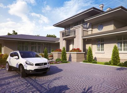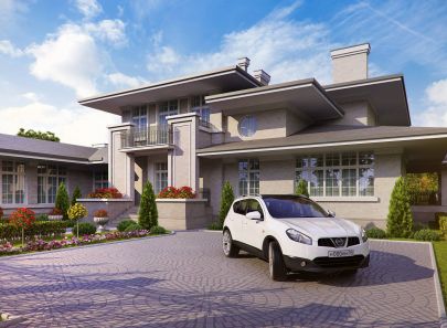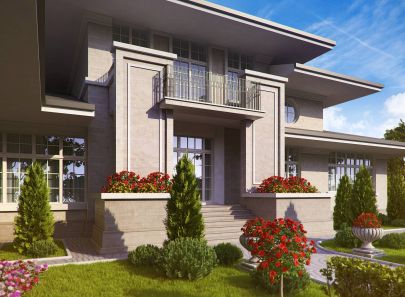 Тяжелые пилоны, обрамляющие вход по бокам, создают ощущение парадности и монументальности здания. Эти элементы принимают на себя роль композиционного центра дома и задают правильный тон. Одновременно с этим, планировка дома очень интересна и предлагает массу вариантов для комфортного отдыха. Обилие больших окон делает внутренние помещения светлыми и уютными.