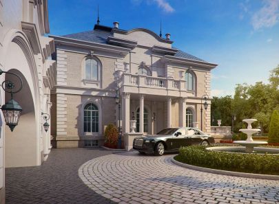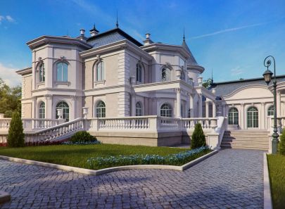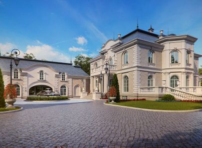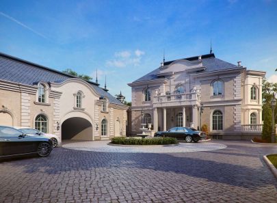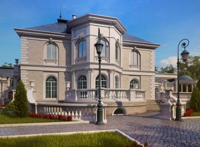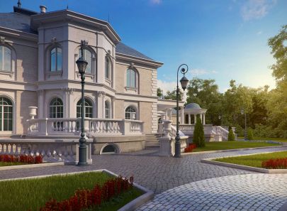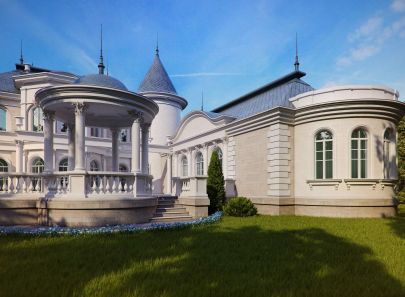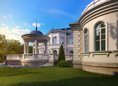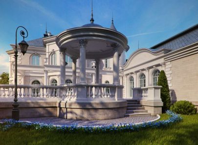 Фасад кирпичного загородного дома, построенный в праздничном стиле рококо, отмечен яркими барокковыми мотивами. Особенно хорошо это заметно в оформлении беседки, а также самой территории.