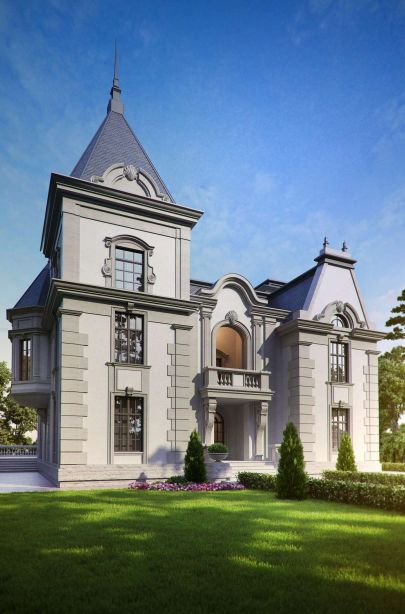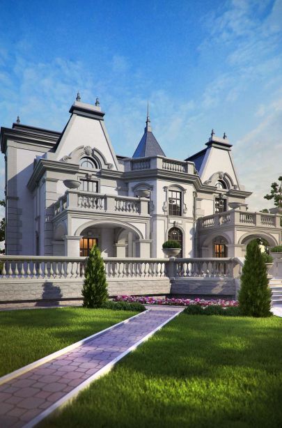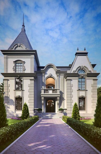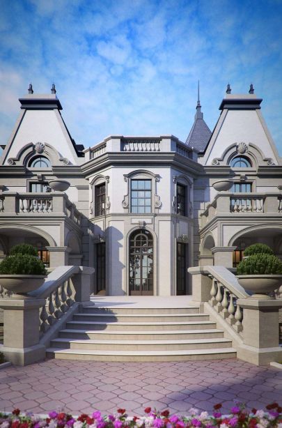 Оригинальный проект дизайна фасада дополняет не только сам дом, но и окружающую территорию, начиная с увенчанной цветочными вазонами балюстрадой и заканчивая тщательно проложенными тропинками и ухоженной декоративной растительностью.