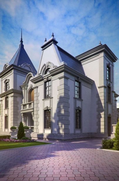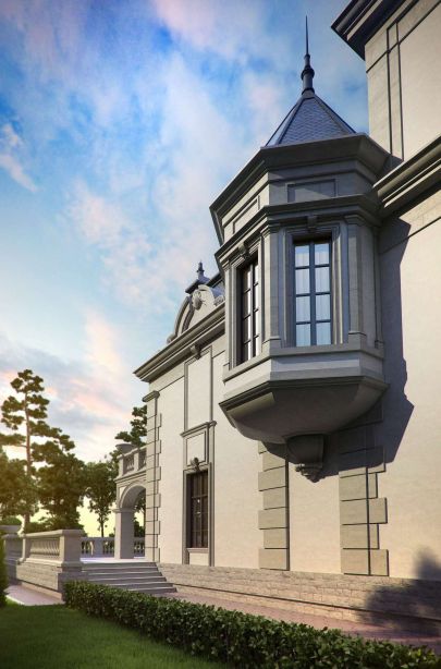 Проект фасада дома обладает совершенно уникальным лицом, поскольку его можно смело отнести к эклектическим архитектурным формам.