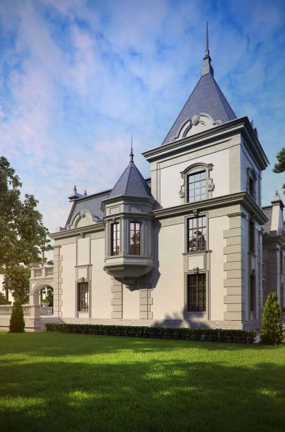 Оттенки отделочных материалов очень сдержанные, словно говорящие о надежности и долговечности этого масштабного, впечатляющего своими размерами дома. В его композиционном построении заметна классическая симметричность – принцип, проверенный на протяжении многих столетий.