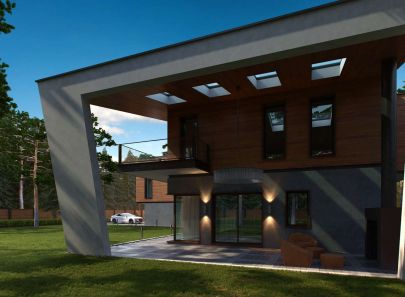 Линейная организация и динамика дома, а также стремительные линии выделяют его среди прочих загородных домов выполненных в том же стиле.