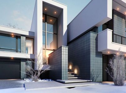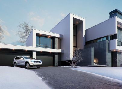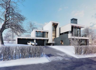 Загородный дом спроектирован согласно принципам конструктивизма. В оформлении фасада дома заметен культ эстетики прямого угла, внимание к мельчайшим соединениям, столь присущее этому популярному ранее стилю. Также стоит обратить внимание на яркий контраст белых поверхностей и темных облицовочных материалов, а также обрамлений окон.
