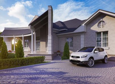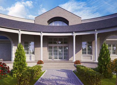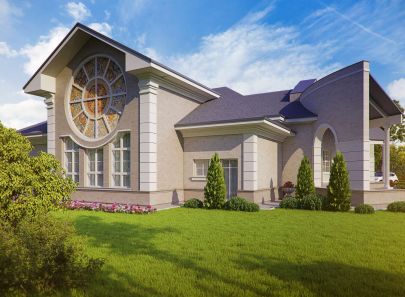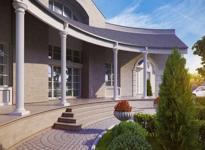 Вопреки смешению стилей в доме, дизайнерские решения фасада полукруглой формы получились очень сдержанными и элегантными, впитав в себя все лучшее от трех избранных стилей.