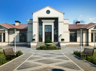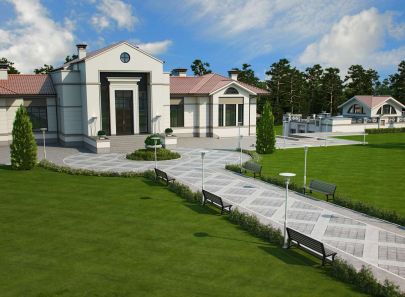 Аллея с искусственным водоемом, скамьями, клумбами и прочими декоративными элементами – особое достояние роскошного загородного поместья. Она украшает территорию и добавляет особого шарма фасаду дома белого цвета.