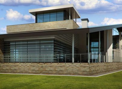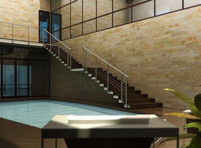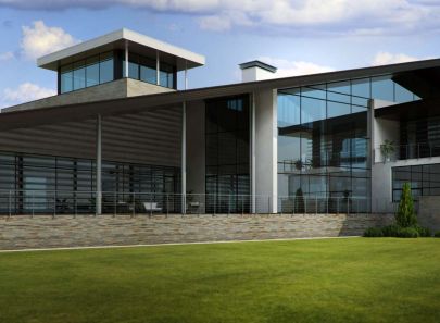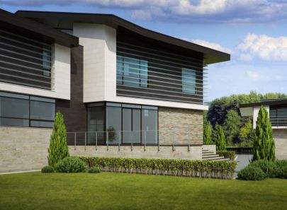 Загородное поместье состоит из двух домов – главного и вспомогательного – объединенных общим открытым пространством. Важность главного сооружения подчеркивает цоколь, который превозносит помещение над уровнем земли.