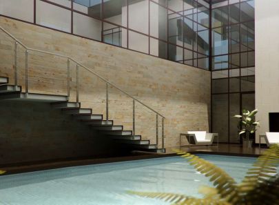 Основное строение сосредоточено вокруг центрального атриума с бассейном. Именно этот атриум можно назвать центром строения, его сердцем, вокруг которого все организовано. Но, несмотря на это, он чрезвычайно гармонично интегрирован в окружающую среду.