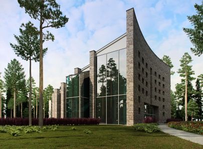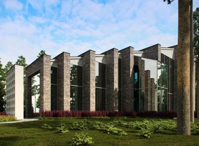 В строении гармонично соединяется ритмичность основного сооружения и растровая скульптурность его дополнительных элементов.