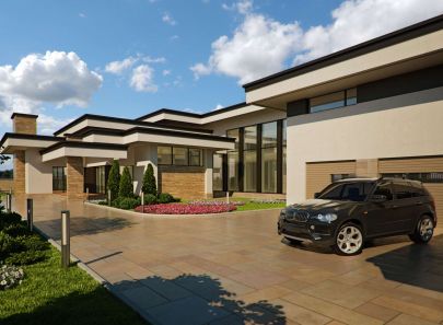 За счет всех архитектурных элементов дизайн фасада дома в современном стиле выглядит стильно и оригинально.