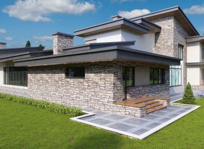 Декор дизайна экстерьера фасада частного дома обусловлен архитектурной пластикой конструктивных частей сооружения и всего строения в целом. Оштукатуренные белые поверхности подчеркнули пространственную сложность здания. А использование в отделке натурального камня позволило визуально выделить отдельные горизонтальные и вертикальные плоскости, усилив образную экспрессивность особняка.