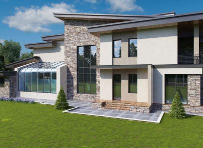 Образная оригинальность просторной загородной резиденции общей площадью 880 м.кв. обусловлена нестандартным подходом к интерпретации традиций классического конструктивизма. Простая геометрия отдельных блоков строения была объедена проектировщиками бюро ТопДом в сложную целостность, архитектурный ритм которой ассиметричен и экспрессивен.