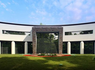 Полусферическая композиция построена на контрастном смешении визуально тяжелых и прозрачно-легких объемов, в формировании которых главная роль отведена стеклу и бетону.