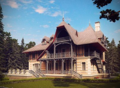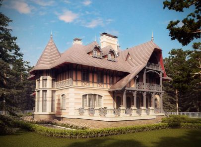 Большие террасы и многочисленные крытые балконы, размещенные по всему периметру декоративных фасадов частного дома, открыли особняк окружающему его пространству, образовав уютные площадки для уединенного отдыха.