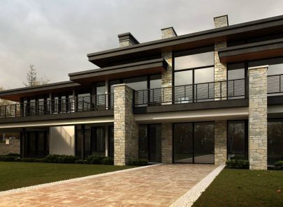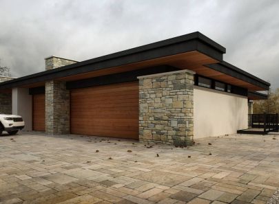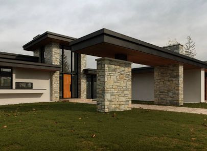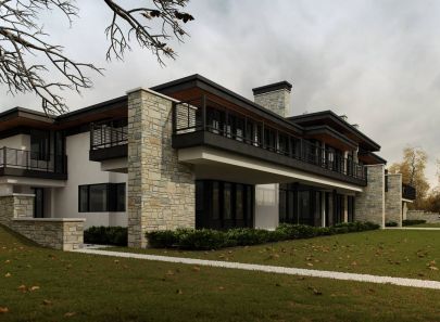 Стилям, используемых в дизайн-проекте экстерьера, присуща любовь к природным материалам, уделяется большое внимание детализации, кладке, а также способам стыка конструкционных элементов. Несложно заметить, что нарочито грубо отесанный камень дополняет четкое масштабирование пропорций и дает едва уловимое ощущение балансировки на грани грубости и утонченности. С этой же целью подчеркнут контраст между мощными каменными фрагментами и изящными металлическими и стеклянными вставками.