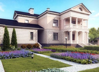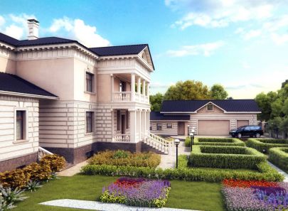 В отделке фасадов дома в классическом стиле использованы натуральные фактуры, естественный светлый тон которых приятен для взора. Дом и его декорированный участок гармонично вписываются в атмосферу загородной жизни, а их смелые дизайнерские элементы выделяют постройку среди прочих.