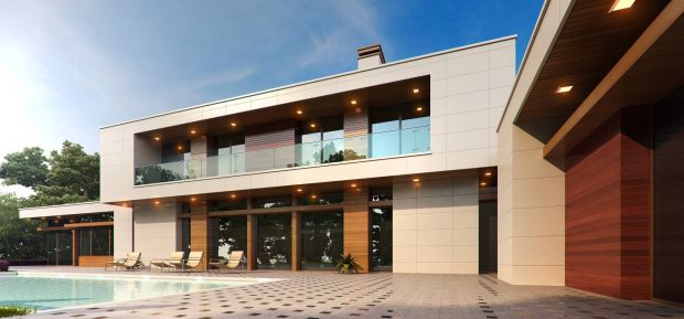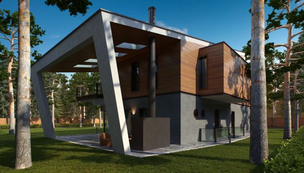 Современное направление дизайна фасадов частного дома, в котором доминирует функциональность и удобство, простота оформления и сдержанность объемных решений. Фасад отделывают стеклом, пластиком, металлом, сайдингом, плитами из керамзита. Цветовая палитра: белый, стальной, черный, цвет натурального дерева. Такие дома прекрасно впишутся как в городской пейзаж, так и в природное окружение.