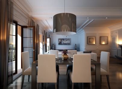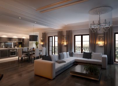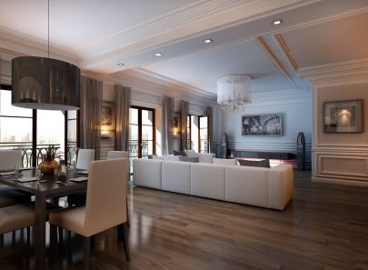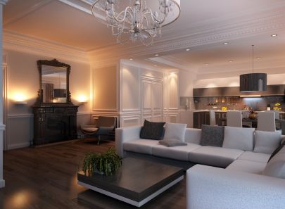 Планировочное решение проекта дизайна классического интерьера квартиры отводит гостиной, столовой и кухне практически треть всей площади квартиры.