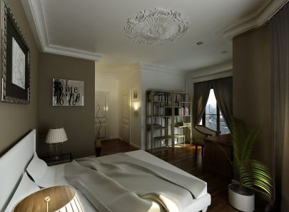 Балансируя на стыке стилей, авторы проекта обыгрывают традиционные для классики мотивы современными приемами: к примеру, люстра над зоной отдыха помещена в полупрозрачный плафон.
