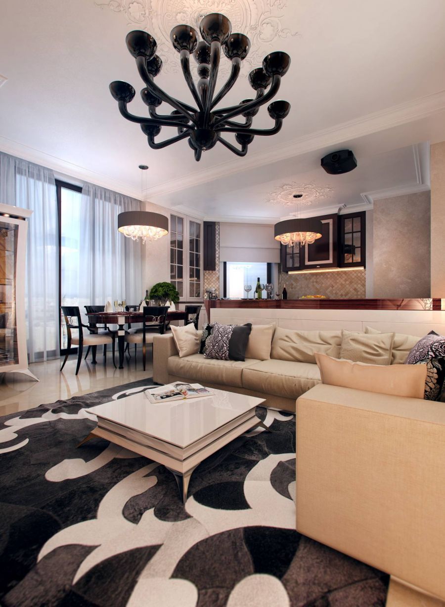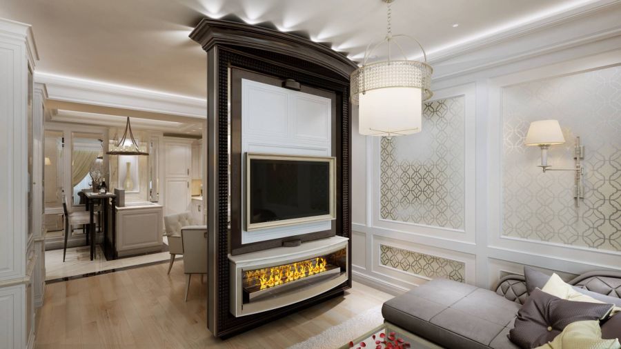 За счет объединения пространства, использования светлой палитры и богатого декора обстановка выглядит парадной, как и положено традиционному окружению. А установка встроенной техники на кухне и в ТВ-зоне воплощает уровень комфорта для современного городского жителя.
