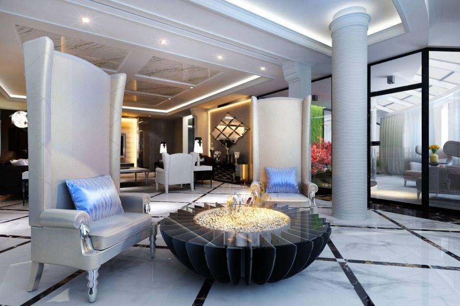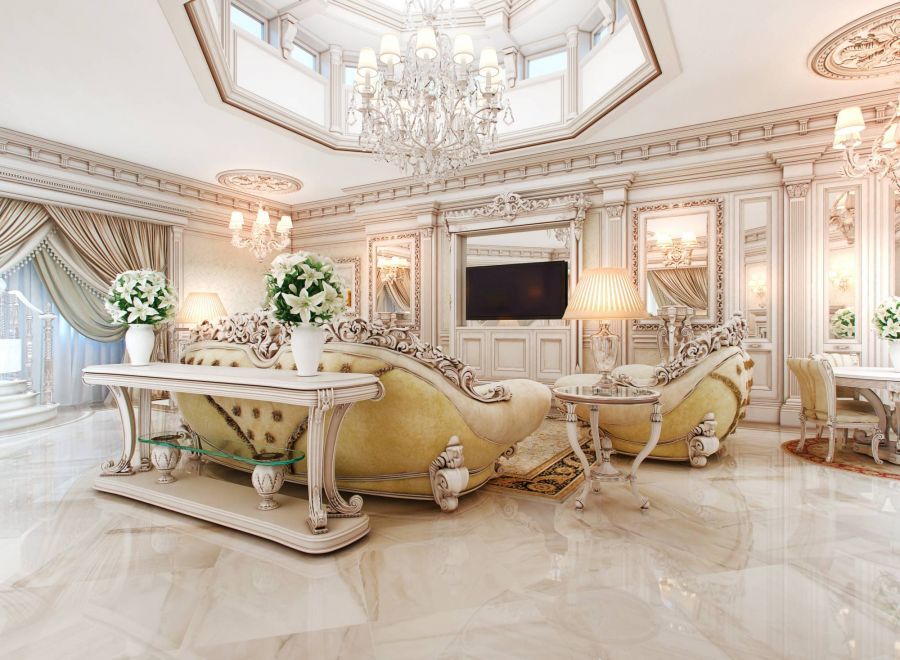 Проект интерьера дорогой квартиры – вид дворцового оформления, которое идеально подойдет для элитного жилья площадью от 500 кв. м. Задача создать роскошную обстановку решается не обилием позолоты, а элементами античного стиля: декоративной лепнины, резной мебели, мраморной облицовки, многослойной драпировки, классического чистого белого цвета. Особое внимание уделяется меблировке, где массивные диваны и кресла с великолепной резьбой соседствуют с образчиками римской архитектуры в дизайне кухонного гарнитура.