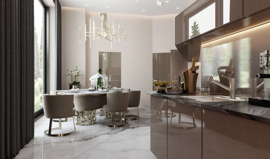 Пример использования нейтральных цветов в интерьере – оформление обеденной зоны оттенком кофе с молоком. Тот случай, когда приглушенные тона звучат по-особенному в сочетании с золотистыми акцентами: ажурной опорой стола, ножками полукресел, центральным светильником. Строгие шторы цвета мокко на панорамном окне – прекрасное дополнение в рамках лаконичной отделки.