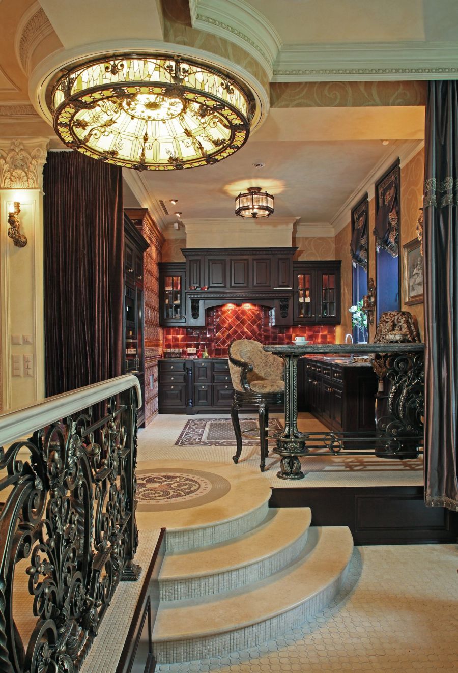 Проект классического темного интерьера команда "ТопДом" реализовала для двухуровневого жилья в пентхаусе. Оттенок слоновой кости в отделке стен и пола – в вариациях от бледного до насыщенного – стал прекрасным фоном для эффектных деталей. Черный кованый декор украшает лестничные перила и арки проходов, в спальне узор из патинированного металла обрамляет изголовье кровати, черный кухонный гарнитур акцентирован рубиновой настенной плиткой. Активную роль в цветовой гамме играет текстиль: темно-бордовое убранство спальной комнаты, шоколадно-коричневые шторы при входе на кухню.