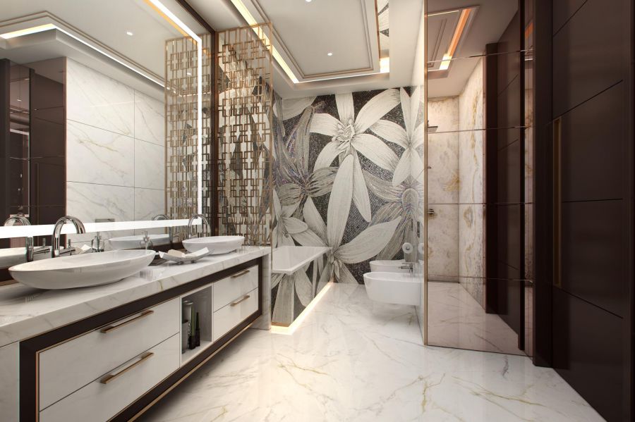 - глянцевый мраморный пол в белых тонах с орнаментальными вставками в каждой из зон;