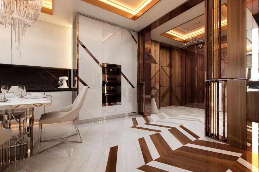 - на объединенной площади холла, кухни и гостиной – глянцевые стеновые панели медной тонировки, зеркальные полосы, деревянная обшивка с декором, полированный пол из белого и бежевого мрамора с деревянными вставками, металлические каркасы мебели;