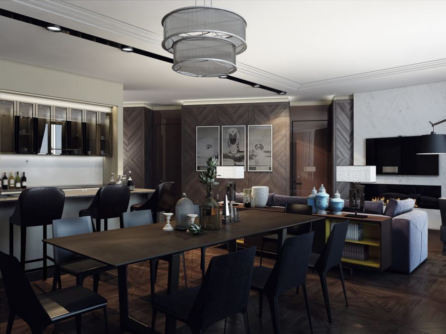 Для просторных апартаментов мы разработали оформление общественной части – гостиной, прихожей, кухни и столовой – в классическом стиле. Зоны совмещены друг с другом, что позволяет создать единое стилистическое пространство, хорошо освещенное тремя большими окнами.