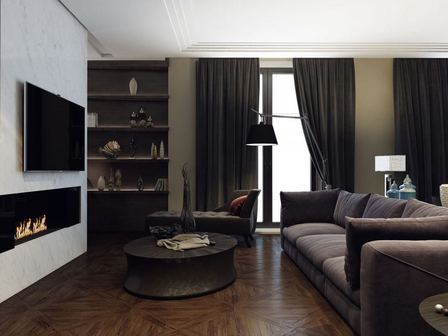 В проекте интерьера большой кухни-гостиной темная коричневая палитра смотрится благородно и свежо. Объединение зон позволяет красиво выделить стены и пол паркетной раскладкой, она выгодно сочетается с мраморной облицовкой на кухне и в зоне ТВ. Черные стулья, темно-серый диван, графитовые портьеры, глянцевые межкомнатные двери кофейного оттенка умело расставляют цветовые фокусы.