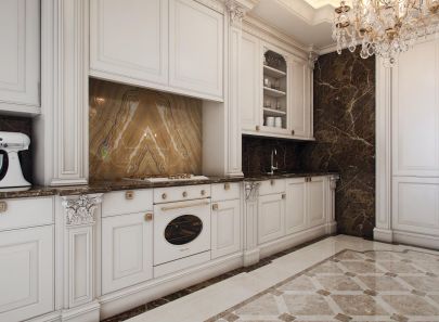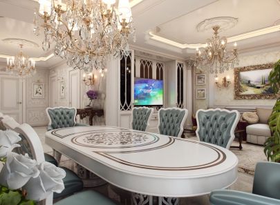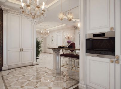 Проект интерьера дорогой квартиры – вид дворцового оформления, которое идеально подойдет для элитного жилья площадью от 500 кв. м. Задача создать роскошную обстановку решается не обилием позолоты, а элементами античного стиля: декоративной лепнины, резной мебели, мраморной облицовки, многослойной драпировки, классического чистого белого цвета. Особое внимание уделяется меблировке, где массивные диваны и кресла с великолепной резьбой соседствуют с образчиками римской архитектуры в дизайне кухонного гарнитура.