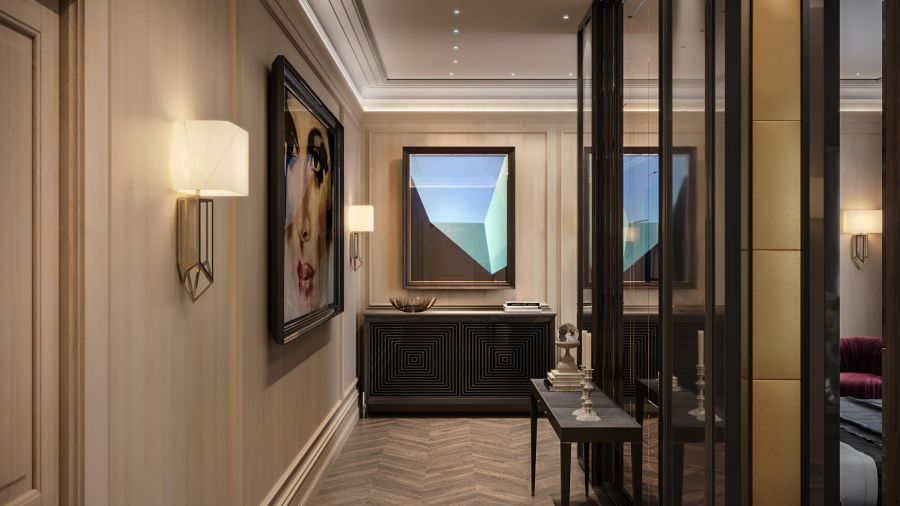 В дизайне преобладают хрустальные, стеклянные и металлические фактуры, они поддерживают блеск интерьерных зеркал и глянца.
