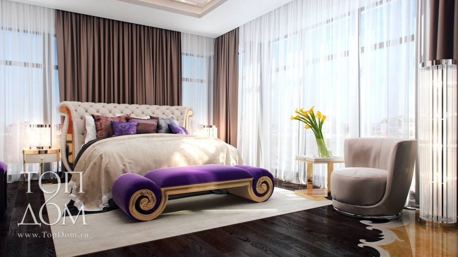 Пример роскошной меблировки представляет наш проект дизайна интерьера большого дома в пос. Никольская Слобода. Логический центр – кровать с простым прямоугольным изголовьем, зато относительно нее группируются объекты, рассчитанные на внешний эффект: объемная атласная стена, сегментированные прикроватные тумбочки, банкетка с пышными валиками-опорами, кресла с цельными подлокотниками-спинкой.