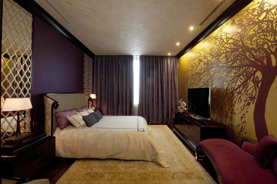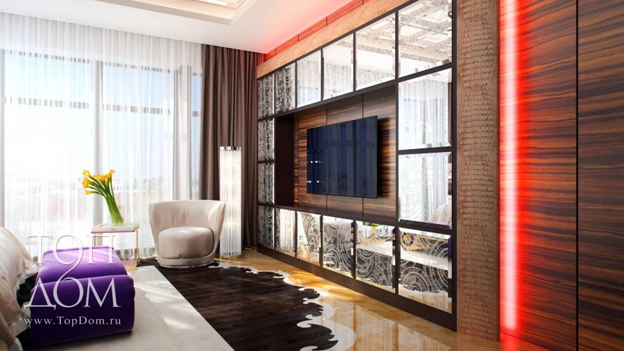 А вот так выглядит комната для сна с яркими акцентами из проекта уникальных интерьеров дома в современном стиле. Гармоничная комбинация темно-коричневых, белых и золотых оттенков с колоритным аккордом в виде фиолетовой банкетки, желтого мрамора и красной подсветки ТВ-зоны.