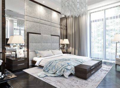 Интерьерная композиция выстраивается вокруг центрального элемента – большой кровати. Главный акцент получает отделка мягкого изголовья: кожей, тканью, строчкой в технике капитоне, деревянным обрамлением. Изголовье обычно высокое, по форме прямоугольное или квадратное (в арт-деко, тяготеющем ближе к классике, может быть фигурное и украшенное резьбой).
