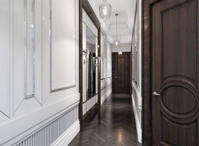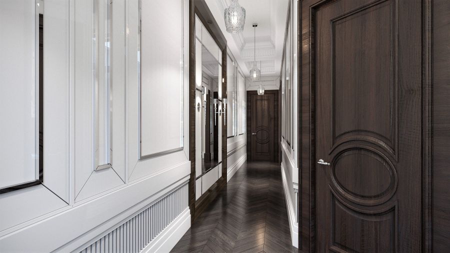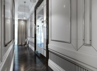 Характерный для стиля акцент на геометрию отчетливо обозначен в оформлении стен. Белые квадратные и прямоугольные лакированные панели с блестящими кантами создают ритмический рисунок, который тематически связывает основное помещение с коридором. Нижний бордюр из рельефных вертикальных планок перекликается с декором потолочных ниш. Объем вытянутого коридора корректирует зеркальное полотно с подсветкой бра.