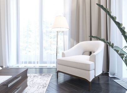 Нейтральный светлый серо-белый фон создают глянцевые стены, мягкая мебель (диваны в зоне дневного отдыха, кресло у окна) и простые по декору, но многочисленные шторы, которые присутствуют здесь в изобилии.
