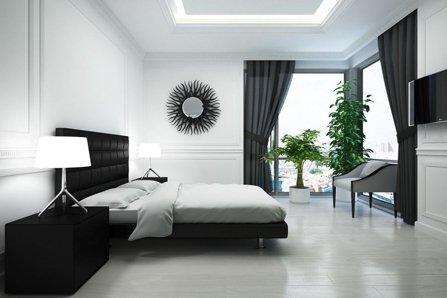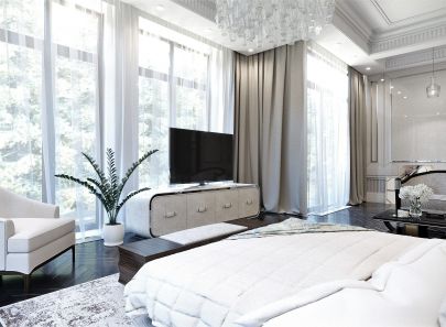 Белая спальня арт деко из дизайн-проекта четырехкомнатной квартиры в ЖК Миракс Парк оформлена сдержанно, с минимальным декором. Стены с молдингами, пол и подсвеченный потолок делают чистый белый цвет доминирующим. Черная мебель, шторы и зеркало – графичные штрихи, которые вносят в слишком светлое пространство баланс.