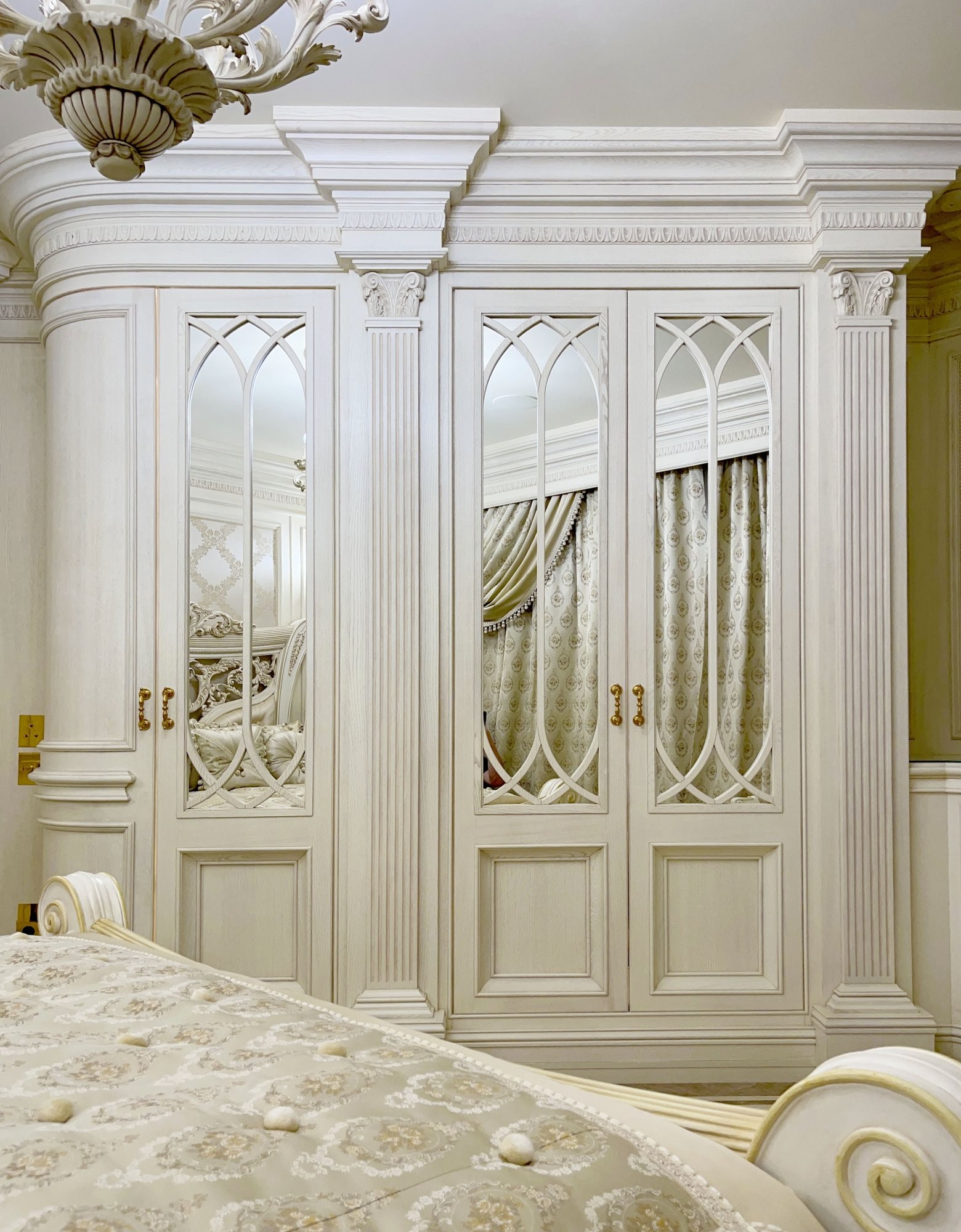 Зеркальные резные шкафы в интерьере спальни