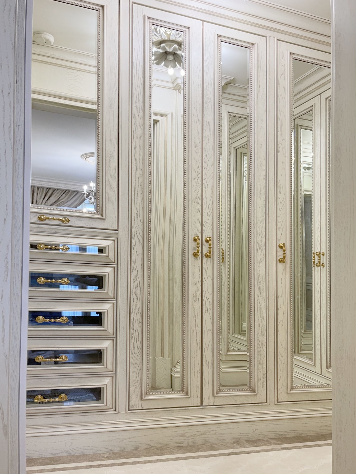 Шкафы в гардеробной из бежевого дерева