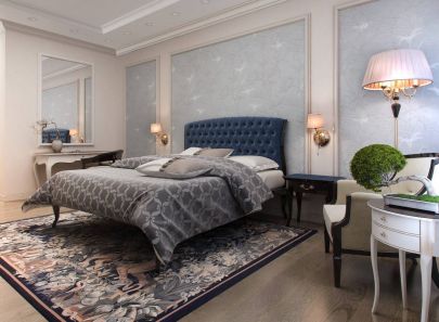 Для спальной же комнаты по проекту выбраны серо-голубые оттенки.