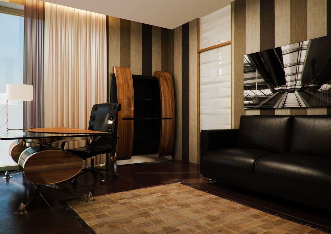 Черный кожаный диван и рабочий стул в интерьере кабинета