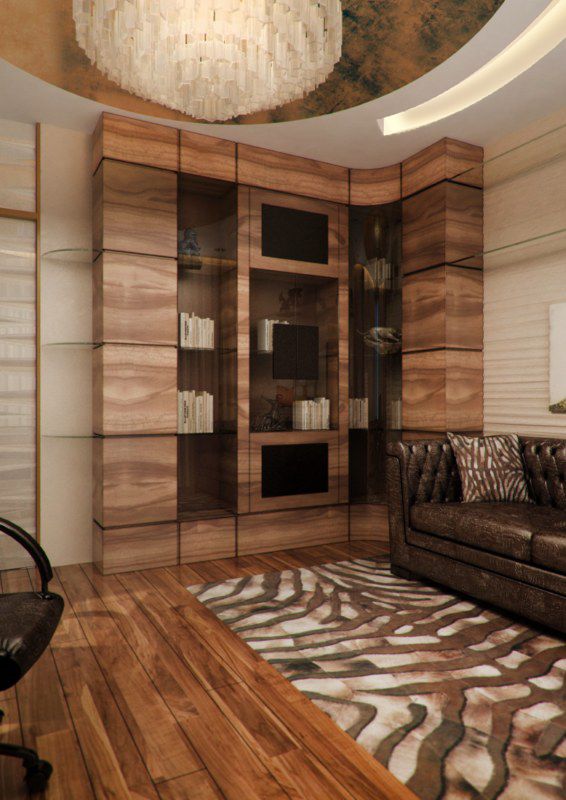 Угловой коричневый шкаф со стеклом в интерьере детской