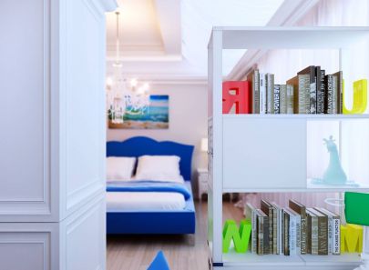 Интерьер детской для мальчика представлен в двух вариантах: в неоклассическом стиле и в более минималистском ключе с яркими синими акцентами в цветовой гамме.