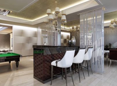 В бильярдной и столовой встроенная в карнизы подсветка помогает подчеркнуть сложное, с множеством ниш, оформление потолков. Барная стойка в бильярдной обшита стеганой тканью в стиле "честерфилд". В этой же манере выполнены стулья в столовой, кресла в библиотеке, в зоне отдыха в спальне.