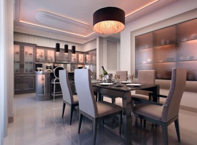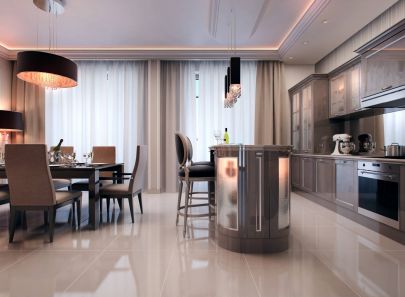 Обеденная зона оформлена в светлых тонах беж, доминанту задают глянцевый пол, гладкие оштукатуренные стены, комод и обивка стульев. В качестве точечных акцентов – обеденный стол венге и такие же темные абажуры люстры и торшеров.