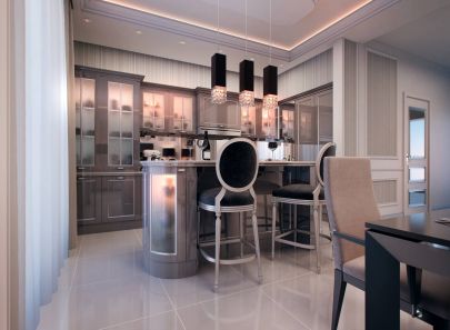 Остров, совмещенный с барной стойкой, вынесен к центру помещения. В боковых стойках сделаны шкафчики для хранения, тоже с подсветкой. Коричневая обивка барных стульев – самый плотный цвет в кухонной зоне, поддержанный дизайном светильников для "островом".