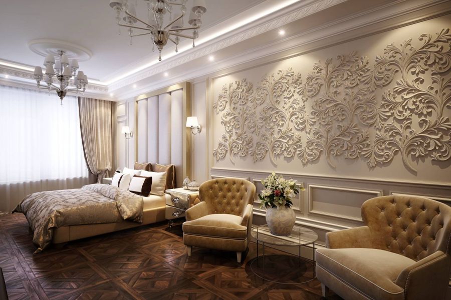 Пример с элементами дворцовой стилистики – золотистый узор на обоях и потолке как дополнение к богатой доминанте.