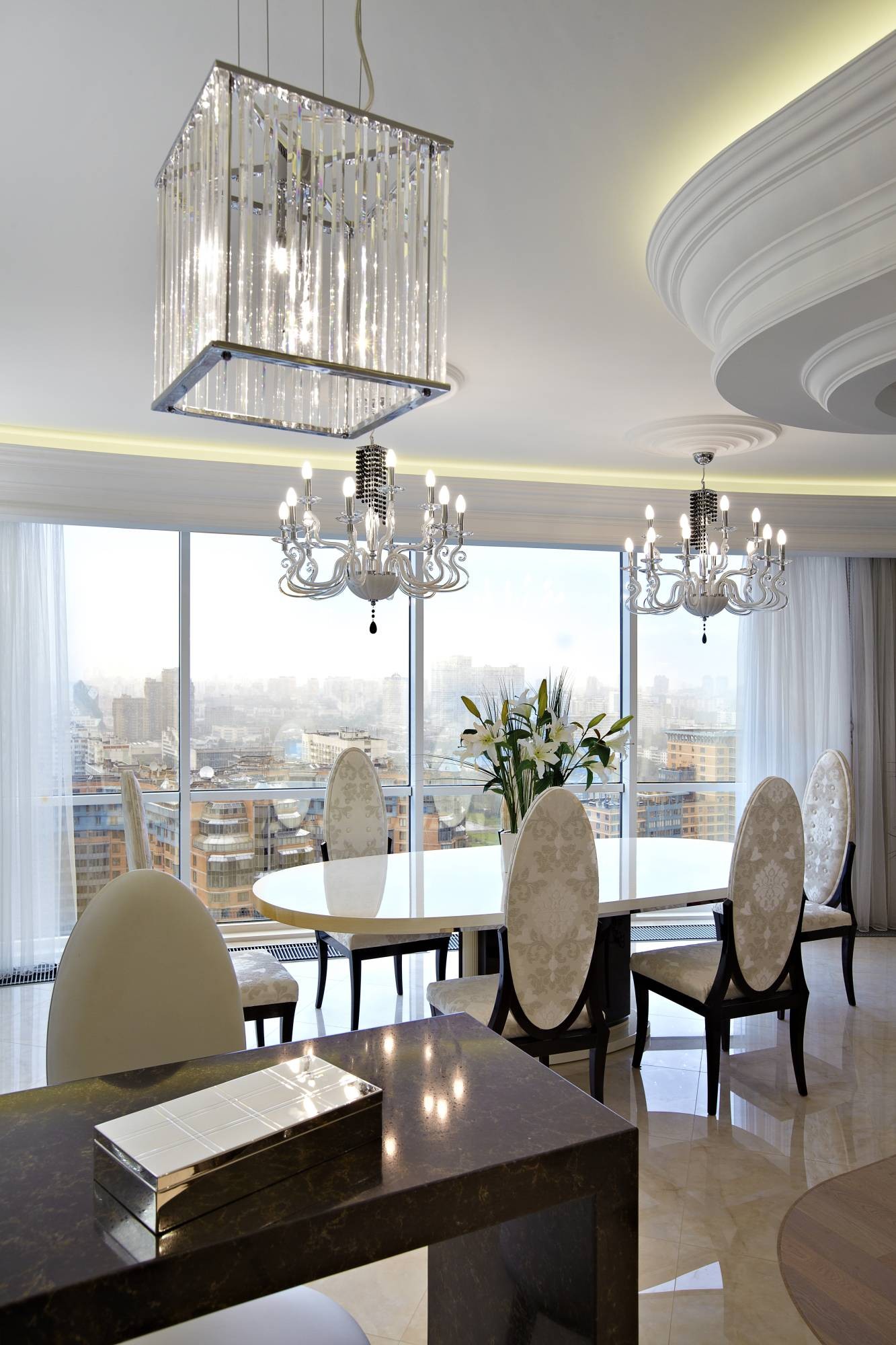 Овальный стол и хрустальные люстры в дизайне столовой